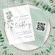 Mariage élégant avec code QR écriture manuscrite Eucalyptus moderne. Ajoutez votre code QR à votre site web de mariage au verso, cela en fait une option pratique pour que vos invités répondent et voient tous les détails sans avoir besoin de cartes de réponse et de détails séparées. Style botanique minimaliste, avec un ensemble de texte manuscrit pour Mariage et le reste du texte que vous pouvez facilement personnaliser. Une branche élégante de feuilles d'eucalyptus à l'aquarelle descend le long du côté gauche.