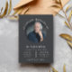 Service commémoratif minimaliste ou invitation funéraire avec une photo de votre être aimé dans un cadre rond. Invitation funéraire gris foncé avec une photo ronde de votre être aimé et le libellé de l'invitation dans un design propre. Elégante invitation de service commémoratif personnalisée avec une photo et In Loving Memory Of en texte courbe autour de la photo. Elégante invitation funéraire pour les hommes.