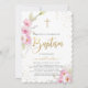 Invitation Baptême moderne et élégante. Le design présente des éléments floraux de couleur rose vif, des arrosages de parties scintillant dorée, le "Baptême" en lettres d'or, croix d'or et détails de la fête. Parfait pour les fêtes du baptême de fille.