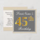 Ces caractéristiques de conception simples et élégantes d'invitation de fête d'anniversaire un message personnalisé comme "le quarante-cinquième anniversaire de FirstName" (avec le "quarante-cinquième" ayant un faux/imitation or-comme le regard de coloration) dans un secteur carré gris-coloré comportant un contour simple. Le nom dans un élégant blanc-est coloré manuscrit-comme le texte, et peut être personnalisé. Les caractéristiques arrières ont personnalisé des détails d'invitation. Une invitation de fête d'anniversaire comme ceci pourrait peut-être être employée en invitant des personnes à une fête d'anniversaire étant tenue pour quelqu'un qui célèbre leur cinquième anniversaire quarante. [~Z0000230]