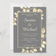 Elégante invitation à un mariage gris foncé avec des feuilles beiges dorés pour un mariage chic et classe.
