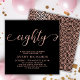 Elégant Chic Black et Rose Gold 80th Birthday Invitation. Ce modèle d'invitation d'anniversaire moderne pour femme présente un texte élégant "quatre-vingts" dans une énorme feuille d'or faux rose script tourbillonnant calligraphie manuscrite (ou typographie) avec la police de queue d'écharpe, détails de fête en couleur or rose rousse sur arrière - plan noir. À l'envers faux rose feuille d'or abstrait cercle tourbillonnant motif sur arrière - plan de couleur noire. Parfait pour célébrer, girly 80jalon anniversaires dans le style, cette invitation ajoute une touche de glamour à toute fête féminine.