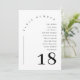 Cette carte de numéro de table minimaliste moderne et simple présente une police serif simple en forme d'arc sur un arrière - plan blanc. Vous pouvez personnaliser/customiser la carte de numéro de table et les noms des invités à tout ce que vous voulez. Remarque : l'illustration des lignes et des éléments graphiques ne peut pas être modifiée, supprimée, déplacée ou modifiée. Elles sont réparées. Vous pouvez customiser et personnaliser le numéro de table du tableau de sièges pour qu'il corresponde à vos besoins de mariage ou de fête.