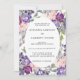 Des roses profonds prune violet se mélangent à des roses roses douces et rousses pour créer un beau faire-part de mariage floral. Il y a beaucoup de verdure, feuille, vignes et bourgeons plus petits pour le garder moderne et aéré. Les bords intérieurs des fleurs et de la verdure créent un ovale. Ceci entoure l'espace blanc contenant les informations mariages. Le fond de l'invitation est vert tendre.
