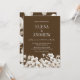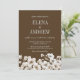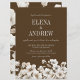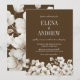 Cette élégante faire-part de mariage florale brune et blanche présente des fleurs d'automne et d'hiver. arrière - plan Brown avec texte blanc et fleurs de mariage blanches. Arrière - plan de fleurs blanches plus grandes est facultatif. Tout le texte, y compris les noms, peut être modifié.