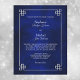 C'est un faire-part de mariage élégant et riche à la recherche pour toute saison. Un cadre argenté géométrique décoré en angle et élégant entoure votre texte mariage, également en argent. Les images et le texte sont placés sur un dégradé bleu royal arrière - plan qui brille presque! L'arrière de l'invitation a le même arrière - plan bleu. Très élégant !