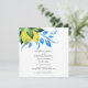 Cette élégante invitation de mariage a été conçue à l'aide de citrons d'aquarelle d'origine dans les tons jaune vif avec le feuillage botanique bleu et vert. Personnalisez avec vos détails personnalisés dans les champs modèle. Parfait pour les mariages à la campagne et à destination. Pour voir la suite mariage moderne correspondante visitez www.zazzle.com/dotellabelle Art et design de Victoria Grigaliunas