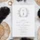 Une élégante invitation de mariage comprend une crête d'art botanique avec votre monogramme. Personnalisez avec tous les détails importants tels que vos noms, la date du mariage, l'heure et l'emplacement du lieu. L'envers est coordonné en noir