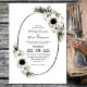 Un élégant faire-part de mariage à fleurs rustique noir et blanc avec des tournesols et des marguerites disposées sur un cadre ovale.