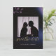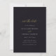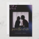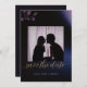 Quelques branches de feuilles eucalyptus, dessinées à la main dans un crayon de couleur et revêtues de teintes poussiéreuses et violettes foncées, font pour un mariage moderne, sophistiqué, élégant et chic, sauvez la date. L'arrière - plan noir et bleu foncé avec des touches de violet et des lumières illuminent le ciel de minuit. L'élégant script de calligraphie, dans la teinte d'or, rend ce design élégant noir et violet encore plus élégant. Un arrière - plan plus foncé fonctionne mieux comme une image pour cette enregistrer la carte de date.