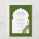 Elégant paon aquarelle dans une arche dorée avec un or et riche arrière - plan paisley vert foncé faire-part de mariage. Parfait pour les mariages indiens.