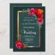 Elégante faire-part de mariage florale rouge et rose avec une bordure verte et dorée profonde et panneau intérieur turquoise pour mettre en évidence les détails de l'invitation.