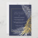 Elégant bleu foncé et blanc Faire-part de mariage tropicale Cette invitation a à la fois l'élégance et le facteur wow. Ce design présente un arrière - plan bleu poussiéreux, des frondes dorées et blanches de palmier et une typographie classique.