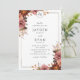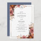 Dégustez vos invités avec cette élégante invitation de mariage avec un design floral d'aquarelle exquis mettant en valeur vos détails mariages. Concevez avec l'option de changer le texte au besoin, ainsi que l'introduction de "avec leurs parents" à "avec leurs familles", "avec une grande joie" ou "avec grand plaisir". Détails floraux dans un beau mélange de tonalités bordeaux, rousses, rose poussiéreuses, pêche, champagne et jaune. Cadre dans une fausse feuille d'or. De retour dans un ton bleu élégant. Ce même design est également disponible avec le dos en bordeaux, en rose roux et en blanc. Une partie d'une collection avec une variété de produits de coordination disponibles.