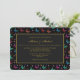 Une élégante invitation au mariage. Conçu avec un motif de fantaisie de papillons dans de nombreuses couleurs vives, contrastant très bien sur l'arrière - plan noir. Les flûtes à bulles, les sprigs et les feuilles apportent une touche de plaisir. Le cadre est noir avec une bordure dorée et le texte de l'invitation est également écrit en or.