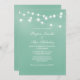 Nouvelle menthe tendance / invitations turquoises à mariage aquarelle avec lumières à cordes blanches et une police de script élégante.