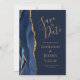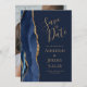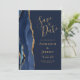 Cette élégante carte de date moderne comporte une bordure en aquarelle bleu marine découpée avec une parties scintillant en faux or. Le texte de couleur or apparaît sur un arrière - plan bleu marine. Remplacez facilement l'image de l'échantillon sur le dos par une photo verticale de la future mariée et mariée.