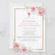 Célébrez le baptême de votre petite fille avec cet élégant design floral avec des roses roses douces et une verdure délicate, accentuée d'une touche d'or. Le design comprend une croix proéminente, ce qui le rend parfait pour une cérémonie de baptême spirituelle et mémorable. Cette invitation ajoute une touche de grâce et de sophistication à votre événement spécial. Customisez avec les détails de votre événement pour créer un faire-part unique et personnel.