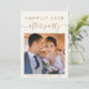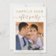 Élégant elopement crème légère ou annonce de mariage privée et invitation à la réception. Le devant présente votre photo "Happily Ever After Party" dans un mélange de typographie or simple et d'un script or chic avec des swashes, vos noms et la date de mariage. Au contraire, personnalisez vos détails de faire-part et d'invitation et ajoutez vos noms dans un script doré ressemblant à une signature.