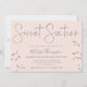 Un script de parties scintillant argenté chic, moderne et élégant typographie Sweet sixteen invitation anniversaire avec parties scintillant scintillante confetti sur éditable pastel rose roux et un arrière - plan argent glittery à l'arrière. Un sweet sixteen luxueux et élégant.