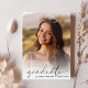 Élégante invitation de la fête de remise de diplômes avec la photo de la grad superposée avec "diplômé" dans un script moderne et leur nom et année de classe dans la simple typographie. À l'envers, ajoutez une photo supplémentaire et les détails de la grande fête.