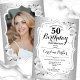 Elégante invitation à 50e anniversaire fleurie avec votre photo au verso de la carte. Design de glam avec faux argent. Comprend des roses blanches, des caractères de script et des confettis. Parfait pour une fête anniversaire adulte élégante. Personnalisez avec vos propres détails. Peut être customisé pour n'importe quel âge ! Invitations Zazzle imprimées ou téléchargement instantané modèle imprimable numérique.
