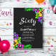 Cette élégante invitation tropicale d'anniversaire est parfaite pour un anniversaire d'été moderne. Le design simple présente des fleurs jaunes, violettes et magenta avec une élégante typographie blanche sur un arrière - plan noir audacieux.
