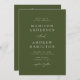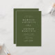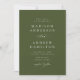 Invitations de mariage élégantes et tout-en-un avec vos noms et informations de cérémonie de mariage sur le devant en lettres blanches avec un arrière - plan vert olive. Un script de calligraphie moderne complète l'apparence de cette faire-part de mariage chic vert olive. Personnalisez le dos des invitations de mariage de calligraphie avec des détails mariages tels que les informations de réception, les hébergements de l'hôtel, les instructions RSVP et le site Web du mariage. Ajoutez le lien de votre site Web mariage souhaité au modèle QR Code fourni afin que vos invités puissent facilement RSVP en ligne et voir des informations supplémentaires sur le mariage. Ce faire-part de mariage de code QR vert olive est parfait pour les mariages formels et décontractés de toute saison.