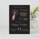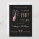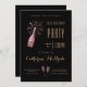 Célébrez son 70e anniversaire avec style avec cette invitation de fête d'anniversaire en noir et or. Une aquarelle d'une bouteille de champagne rose ouverte a un étiquette qui peut être personnalisé avec son année de naissance ou ses initiales, cette année ou autre texte jusqu'à 4 lettres. La typographie élégante est présente partout, et son nom est lancé dans un joli script. Les détails du lieu et de la fête sont séparés par une aquarelle de deux verres de champagne remplis de champagne rose mousseux. Vous pouvez personnaliser l'anniversaire à une autre année si vous le souhaitez.