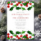 Célébrez la saison des Fêtes avec cette élégante invitation de fête de Noël avec une belle aquarelle sainte et baies. Les tons rouge et vert vif créent une atmosphère festive et accueillante, parfaite pour votre réunion de vacances. Personnalisez avec vos détails d'événement pour en faire le vôtre. Le design classique et les éléments de vacances joyeuses font de cette invitation un choix exceptionnel pour votre fête de Noël. Impressionnez vos invités avec une touche de charme saisonnier et de sophistication.