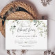 Design caractéristiques Rehearsal Dîner libellé dans un script de calligraphie moderne entouré de verdure d'eucalyptus doré. Customisez facilement avec des informations importantes de choix sur le devant et des initiales monographiques de choix sur le dos.