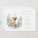 Avec l'invitation florale bleue traditionnelle de la Première Communion catholique avec la Sainte Eucharistie, accentuée d'une belle décoration florale. Au dos se trouve une citation d'Écriture. Les polices, les textes et les images peuvent être modifiés.