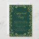 Élégante invitation du Parti de l'Engagement avec une bordure de feuilles et les mots "Parti de l'Engagement" en faux or contre un arrière - plan vert. La carte comprend un côté verdoyant correspondant. Personnalisez-le en remplaçant le texte de l'espace réservé pour ajouter vos informations. Pour plus d'options, cliquez sur le bouton "Personnaliser". *Veuillez noter que le filigrane Zazzle qui apparaît dans l'aperçu du zoom n'apparaîtra PAS sur le produit imprimé final. © Bois de rose et agrumes