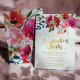 Élégantes invitations à des soirées grand format avec un arrière - plan blanc classique, un joli écran floral rose et rouge d'aquarelle, un titre stylisé de typographie de feuille d'or et un modèle de soirée moderne.