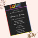 Pride drapeau thème Love lettres répétition dîner invitation avec fond noir! Cette invitation à dîner de répétition mariage complètera votre collection de suites mariages. Le design comprend des lettres d'amour simples et élégantes, utilisant les couleurs du drapeau de la fierté avec des fleurs contre un arrière - plan noir pour créer une invitation à dîner de répétition.