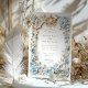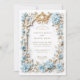 Annoncez votre journée spéciale avec ce luxueux faire-part de mariage aux exquises hydrangées bleues poussiéreuses et aux délicates fleurs blanches entrelacées de détails d'inspiration baroque dorée. Le cadre en faux relief orné ajoute une touche de sophistication, tandis que l'arrière - plan blanc crémeux crée un look intemporel et élégant. Parfait pour les mariages avec un thème vintage, romantique ou régal. Veuillez noter que les accents dorés et les effets gaufrés sont imprimés et n'incluent pas de véritables feuilles métalliques ni de textures surélevées.