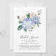 Cette élégante invitation à la douche nuptiale blanche hydrangée bleue est parfaite pour un wedding shower de printemps ou d'été. Le design floral classique est composé d'hydrangées bleu poudre douce, agrémentées de fleurs roses neutres et de feuilles verts.