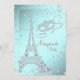 Elégante mascarade parisienne avec la tour Eiffel en diamant et masque de mascarade en diamant sur un arrière - plan bleu et diamant assez turquoise. Cette élégante invitation à la mascarade bleue turquoise est facilement customisée pour votre événement en ajoutant simplement les détails de votre événement, le style de police, la taille et la couleur de police et le libellé. Vous pouvez également supprimer l'arrière - plan bleu turquoise et ajouter votre propre couleur arrière - plan. Il s'agit d'un dessin imprimé sans véritable diamants, parties scintillant, etc.