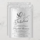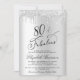 Elégante invitation de fête de 80ème anniversaire avec "80 & Fabulous" dans un script chic, un faux arrière - plan argent et faux parties scintillant argent gouttes. Personnalisez facilement l'année, son nom et les détails de la fête.