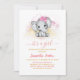 C'est une fille. Illustration adorable d'un beau bébé éléphant avec un ruban rose au-dessus de sa tête. Style peinture aquarelle. L'arrière a un arrière - plan avec des rayures roses et blanches et des points de parties scintillant dorés.