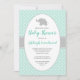 Cette invitation baby shower sans distinction de genre présente une silhouette d'éléphant gris mignon sur un ovale blanc à la limite grise. Les mots "Baby shower" et le nom de la mère à être apparaissent dans la typographie de script cursif vert menthe ; le texte restant est gris foncé. L'arrière - plan motif de pois vert menthe est biscuits par un ruban gris avec une bordure blanche pointillée pour simuler la couture.