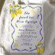 Célébrez la future mariée avec cette Personnalisée Elle a trouvé sa principale invitation de douche nuptiale Squeeze! Doté d'un design au citron frais, cet invitation est parfait pour un thème principal de douche nuptiale pressée. Que vous planifiez une fête de citron nuptiale ou que vous cherchiez une inspiration pour le thème de la douche nuptiale citron, ce design ajoute une touche lumineuse. Explorez les idées de douches nuptiales sur le thème du citron et les idées de douches nuptiales sur le thème du citron pour un événement de charme. Idéal pour les idées de douches nuptiales estivales, cet invitation donne le ton d'une douce fête !