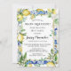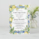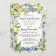 A She Found Her Main Squeeze Lemon Hen Party Theme est la douche nuptiale parfaite. Des agrumes rafraîchissants et cool créent toujours de beaux étalages et des rafraîchissements. La collection Jenny's Lemons prend des citrons chic aquarellés et les associe à des carreaux bleu méditerranéen. Dans ce design, les tuiles créent un cadre bleu. Un cadre mince en or l'élève. Des citrons jaunes, des feuilles verts sauge et un assortiment de fleurs jaunes et blanches décorent le cadre bleu. Elle a trouvé que sa Squeeze principale est écrite en haut. Le reste des détails de la fête de poule suit.