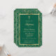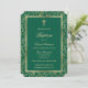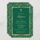 Élégantes invitations au baptême vert émeraude et or fleuri avec une croix d'or à l'intérieur d'un cadre verdoyant.