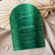 Cet élégant faire-part de mariage moderne en arc présente des bordures de parties scintillant en faux vert émeraude. Le texte personnalisable combine écriture blanche, copperplate et polices italiques sur un arrière - plan en métal brossé vert émeraude. L'envers est assorti d'une parties scintillant et d'une conception en métal brossé.