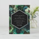 This romantic design features a dramatic and opulent floral arrangement reminiscent of a classical still life painting. A deep and moody palette of rich emerald green, dark teal, and hints of cream creates a stunning effect against a dark background. Lush, painterly peonies and chrysanthemums are densely layered for a truly lavish aesthetic, perfect for an elegant evening affair.