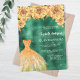 Une invitation moderne, élégante et glamour pour une Quinceañera, 15ème anniversaire. Un arrière - plan vert émeraude clouté avec un faux or une robe et des roses, des fleurs. Le nom est écrit avec un script de style moderne écrit à la main. Personnalisez et ajoutez les détails de votre fête.