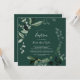 Cette invitation au baptême carré vert émeraude est parfaite pour un baptême bébé boho. Le design élégant et rustique présente des feuilles d'aquarelle vert foncé moody et des eucalyptus aux tons bohèmes modernes.