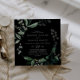 Ce faire-part de mariage carré noir vert émeraude est parfait pour un mariage boho. Le design élégant et rustique présente des feuilles d'aquarelle vert foncé moody et des eucalyptus aux tons bohèmes modernes.