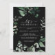 Ce noir vert émeraude fêtons l'invitation est parfait pour une fête de fiançailles, mariage après la fête, la retraite, la remise des diplômes ou tout événement heureux. Le design élégant et rustique présente des feuilles d'aquarelle vert foncé moody et des eucalyptus aux tons bohèmes modernes.